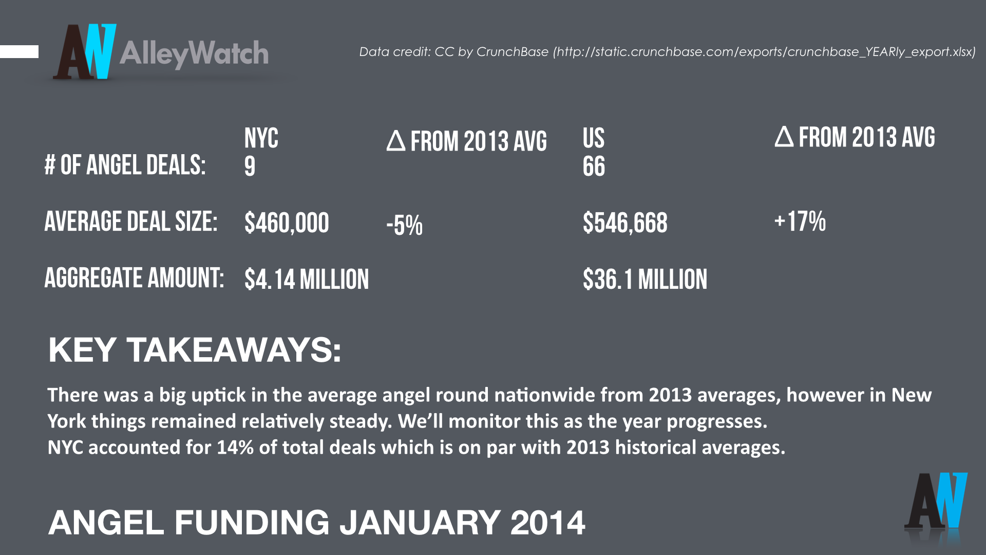 There was a big uptick in the average angel round nationwide from 2013 averages, however in New York things remained relatively steady. We’ll monitor this as the year progresses.