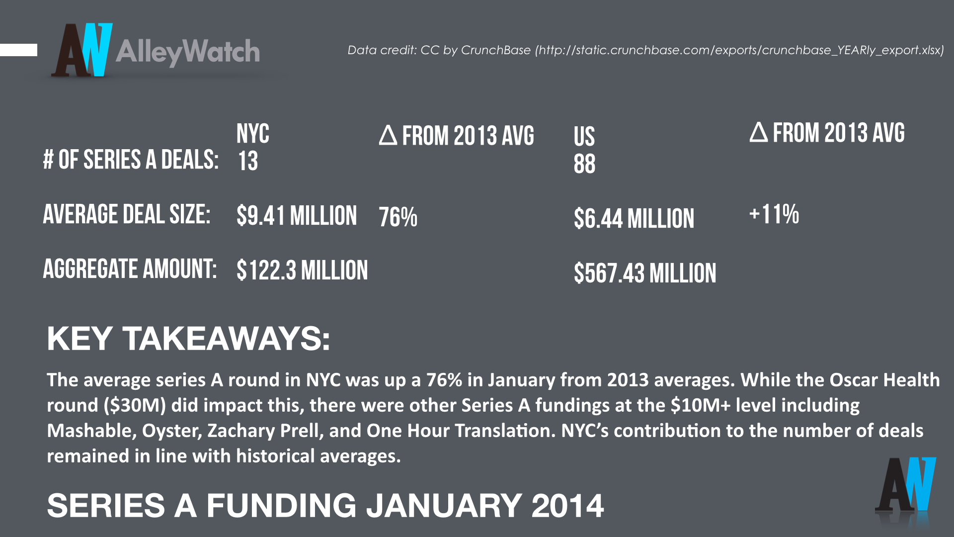 The average series A round in NYC was up a 76% in January from 2013 averages. While the Oscar Health round ($30M) did impact this, there were other Series A fundings at the $10M+ level including Mashable, Oyster, Zachary Prell, and One Hour Translation. NYC’s contribution to the number of deals remained in line with historical averages.