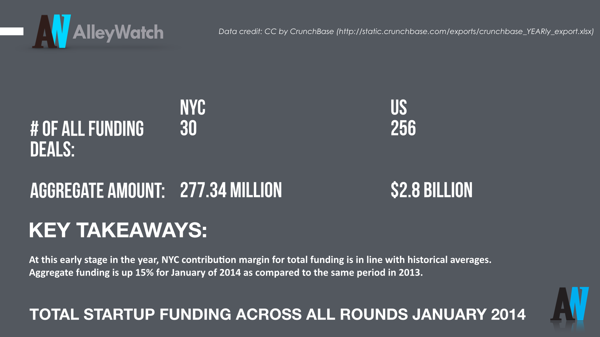 Aggregate startup funding is up 15% in NYC for January of 2014 as compared to the same period in 2013 Tweet this