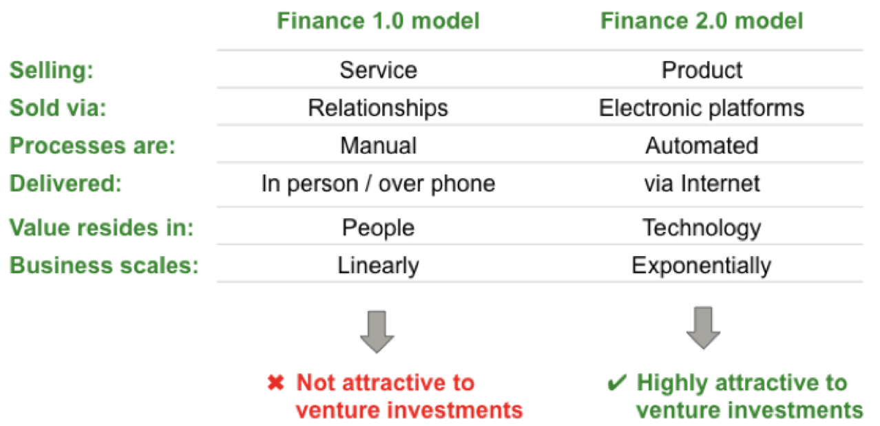 Below is a table that sums up the Finance 1.0 vs. Finance 2.0 business models and demonstrates how these new platforms are highly attractive to venture investment. Needless to say, these new business models are what we look for at ValueStream.