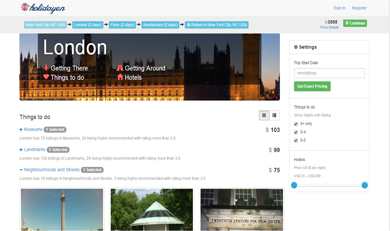 Holidayen is an automatic, personalized travel planning service that helps travelers effortlessly plan and book amazing holiday experiences. It allows users to create completely customized travel packages, offering recommendations and booking options for attractions, activities, hotels, tours and authentic cultural experiences in more than 300 destinations worldwide. Holidayen also provides an optimized itinerary for every single day of the trip that can be accessed via any device and shared with friends. By partnering with Expedia and Viator, we have ensured that travelers get the best deals for any itinerary at a given destination.