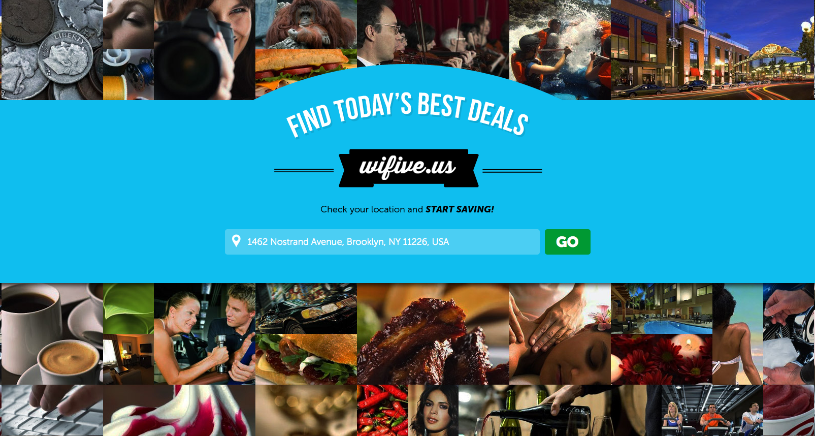 wifive.us is a search engine for daily deals. The service finds deals by category, like food, drinks, shows, health, beauty, etc., based on the user’s location. The deals come from the Groupons, LivingSocials, Amazon Locals, and Hautelooks of the world, covering over 95% of available live deals.