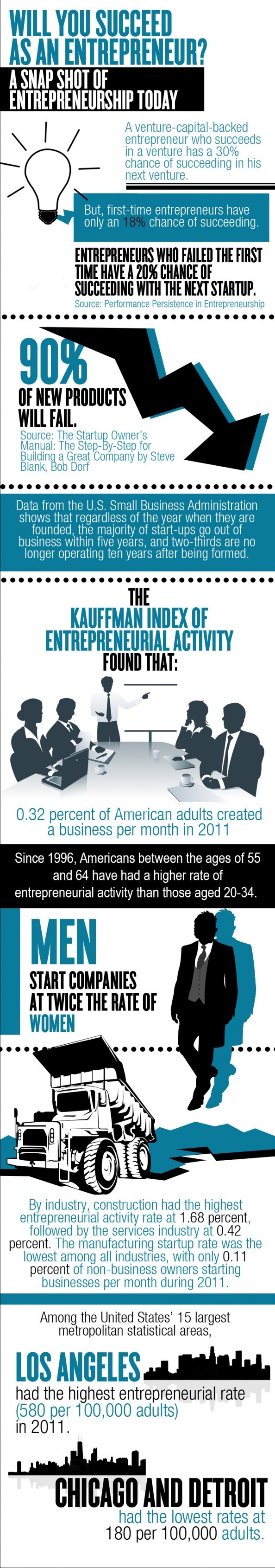 More often than not, the biggest fear of an entrepreneur is the possibility of failure, and for good reason. First-time entrepreneurs have only an 18% chance of succeeding, with the majority of startups going out of business within five years and two-thirds no longer operating ten years after inception. However, there is hope! Entrepreneurs who succeeded their first time have a 30% chance of succeeding with their next startup, and men are twice as likely to start companies than are women. . Take a further look at this infographic to find out more about entrepreneurs in the U.S. and what your chances of success are!