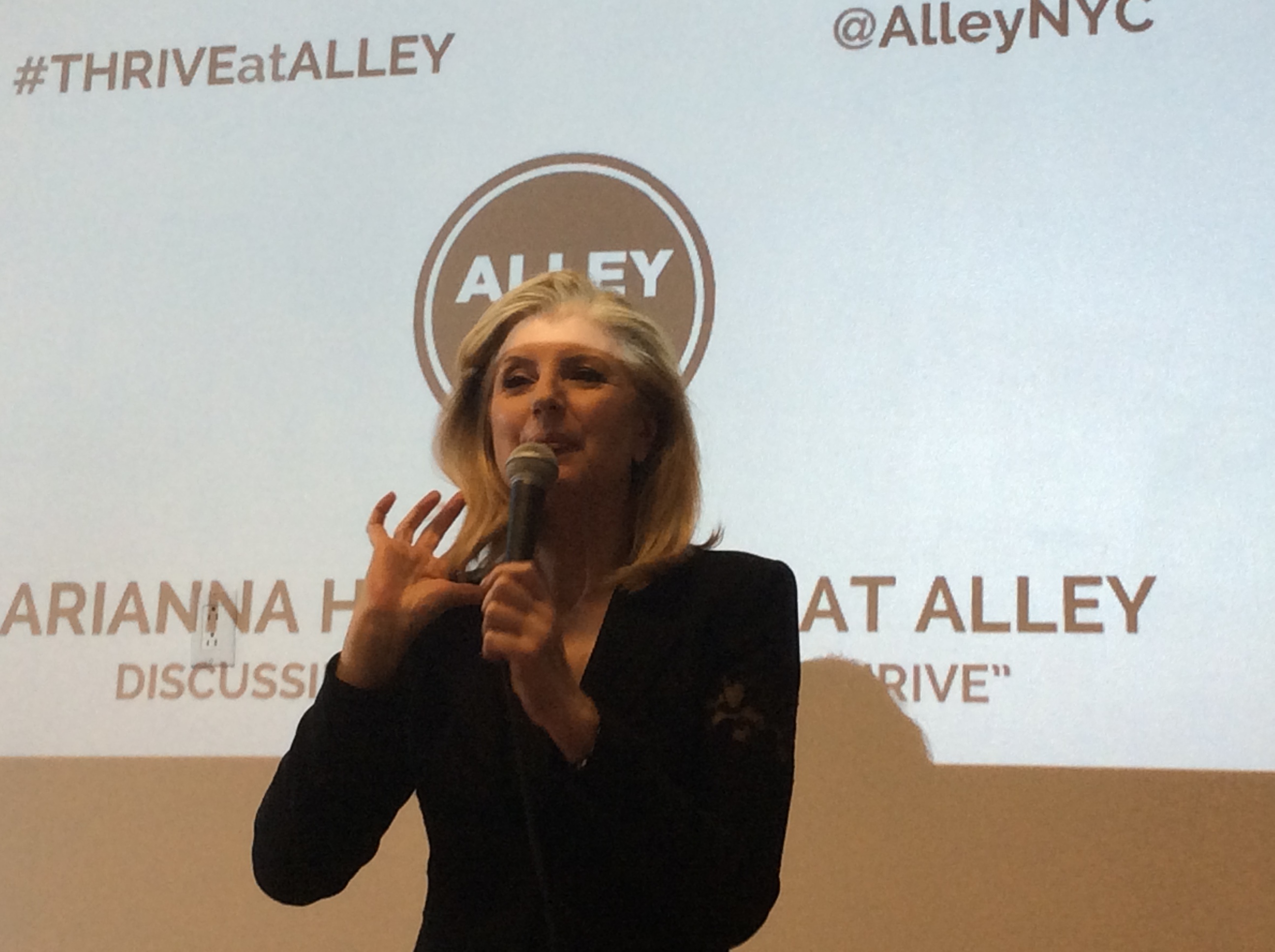 A good question to pose to a packed house of overworked, no doubt perpetually fatigued entrepreneurs at AlleyNYC, where Huffington was hawking her book, Thrive: The Third Metric to Redefining Success and Creating a Life of Well-Being, Wisdom, and Wonder. Pretty funny that her wake up call was to get more sleep.