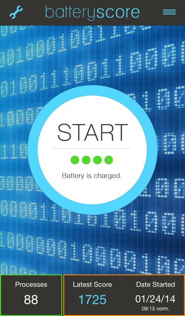 BatteryScore – is the very First and Only iPhone Battery Benchmarking Application. BatteryScore allows users to benchmark the strength of their iPhone battery. The application operates by running a stress load test on the iPhone and then measuring the battery degradation over the period that the test runs.
