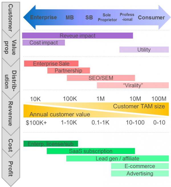 Cost is a tough value proposition: Take a look at the value proposition dimension. You will notice that cost (eg, cost savings) doesn’t extend to the right beyond medium sized businesses. So all to you startups selling into the cost side of SMB, professional and consumers’ P&L, good luck. It is a tough road. Not impossible, but tough all the same. It is very difficult to get SMB or professionals’ attention by saying, “hey, you know that line item that is 10% of your cost structure? I can save you 10% on it.” Snore. That is 10% of 10%, or 1% to the bottom line. They would much rather spend the same time learning and investing in a way to raise revenue 5%!