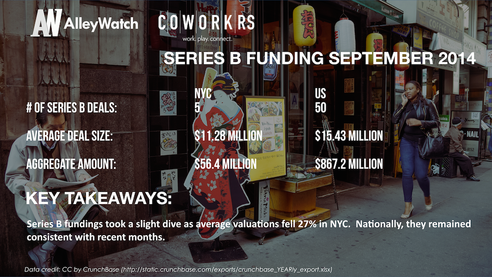 Series B fundings took a slight dive as average valuations fell 27% in NYC. Nationally, they remained consistent with recent months.