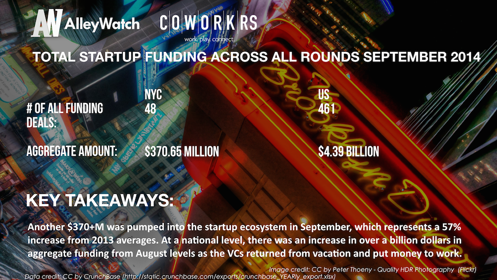 Another $370+M was pumped into the startup ecosystem in September, which represents a 57% increase from 2013 averages. At a national level, there was an increase in over a billion dollars in aggregate funding from August levels as the VCs returned from vacation and put money to work.
