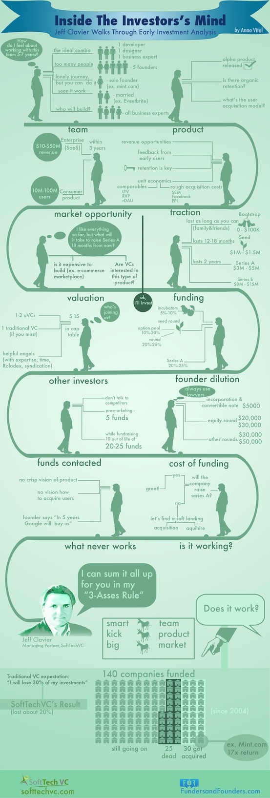 Have you ever wondered what goes through an investor’s mind when you pitch an idea to them? If the answer is yes, then look no further. There are many things, such as: what the ideal combination of people to work with for an extended period of time, whether or not the product has organic retention and whether or not a product can gain traction. This infographic by Funders and Founders writer Anna Vital gives a detailed look into the mind of SoftTechVC’s Managing Producer Jeff Clavier.