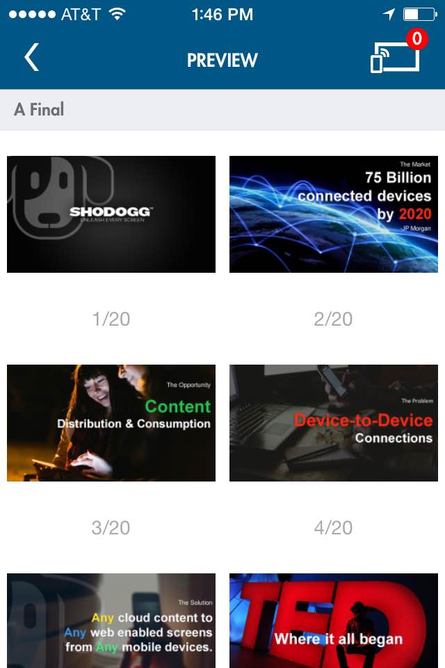 Shodogg is the next-generation content mobility platform, designed to give enterprise content management the same agility as the consumer market. Our patented Shodogg technology turns any connected mobile device (smartphone, tablet, etc.) into a Cloud Remote Control, able to access digital content stored on any cloud or secure server, and instantly cast that content to any other connected screen (smartphone, tablet, computer, smart TV, etc.).