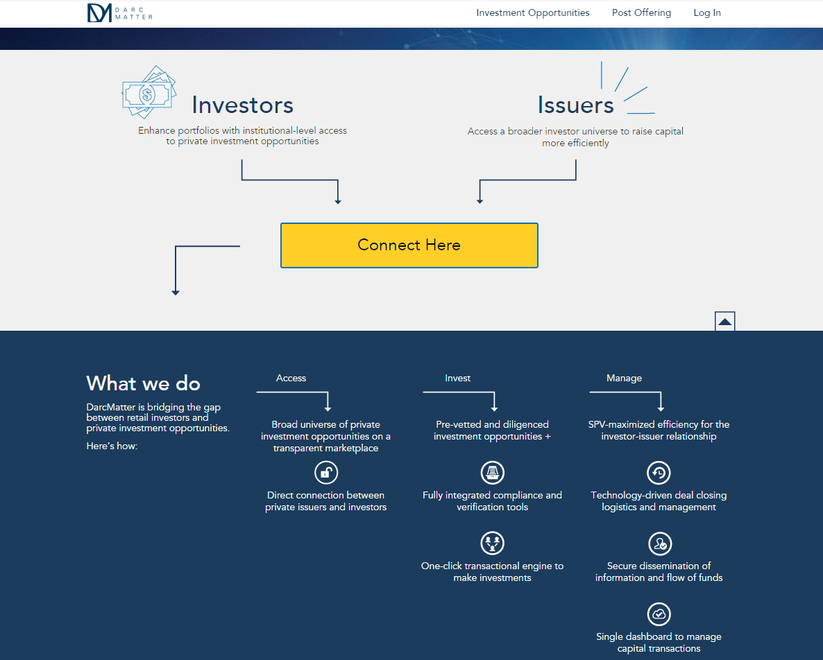 DarcMatter is an online investment platform that provides retail investors with transparent access to private investment opportunities such as venture capital, private equity, hedge funds, and commercial debt products. By utilizing proprietary structuring and technology, DarcMatter is able to provide a frictionless process for both investors and private issuers while remaining fully compliant of all current financial regulations.