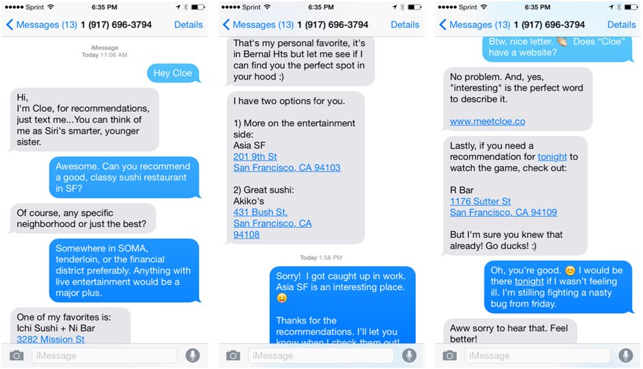 Now imagine that instead of a Google text field or browser bar, you get a familiar Text Messaging interface and you can ask questions. Here is what happens next: