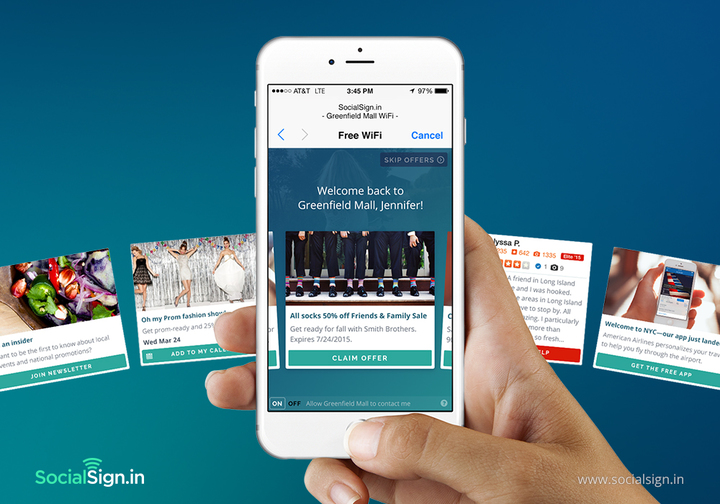 SocialSign.in enables the best commercial venues to turn their guest WiFi into an incredibly effective marketing and sponsorship channel. SocialSign.In’s customers use our technology to cultivate a highly qualified, valuable audience using the foot-traffic they already have. Our research shows that more people will use our customer’s guest WiFi and then visit their homepage, social media or apps combined. Our technology works without needing to change user behavior, having to install an app or face user permission challenges. Each visitor is accessible to serve personalized offers and engaging content while generating valuable CRM data and promotable email relationships. Take advantage of your current foot traffic in real time using SocialSign.in.