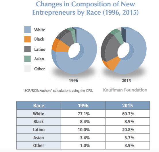 The good news is that things are slowly changing overtime. In its freshly released Index of Startup Activity: National Trends report for 2016, the Kauffman Foundation showed that the number of non-white founders, both men and women, has been increasing since 1996: