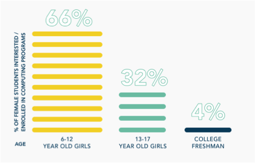 The nonprofit Girls who Code notes that 74% of middle-school girls are interested in STEM subjects, but only 0.4% chose a computer science major in college: