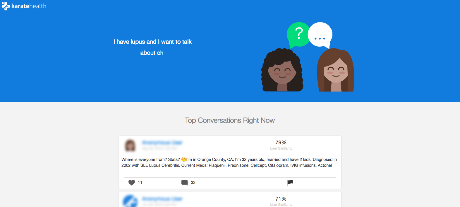 Karate Health, founded by Arif Sorathia and Brett Adelman, is a mobile platform for those affected with chronic conditions like lupus. The platform provides peer conversations along with the educational materials to improve outcomes. The company appears to have pivoted from its earlier iteration, which focused on medicinal adherence through incentivization.