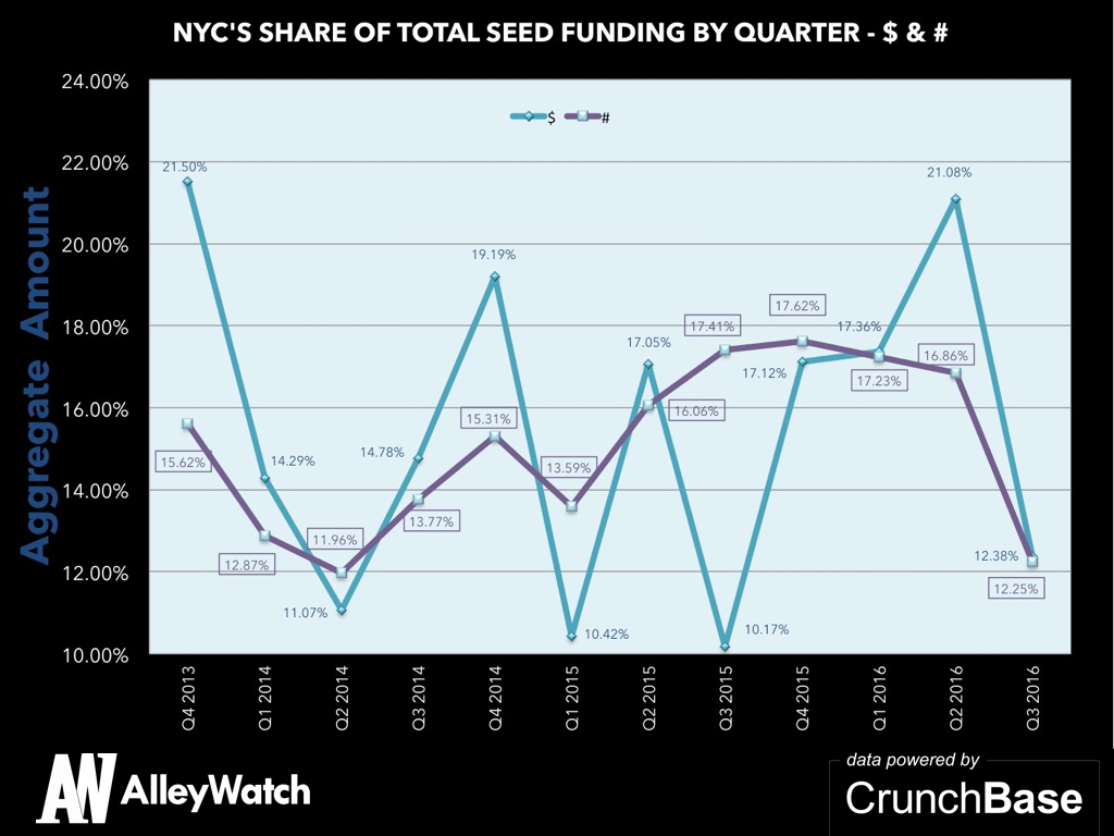 Q3 2016 NYC Seed rounds comprised 12.38% of total $ amount in the US with 12.25% of deals Tweet this