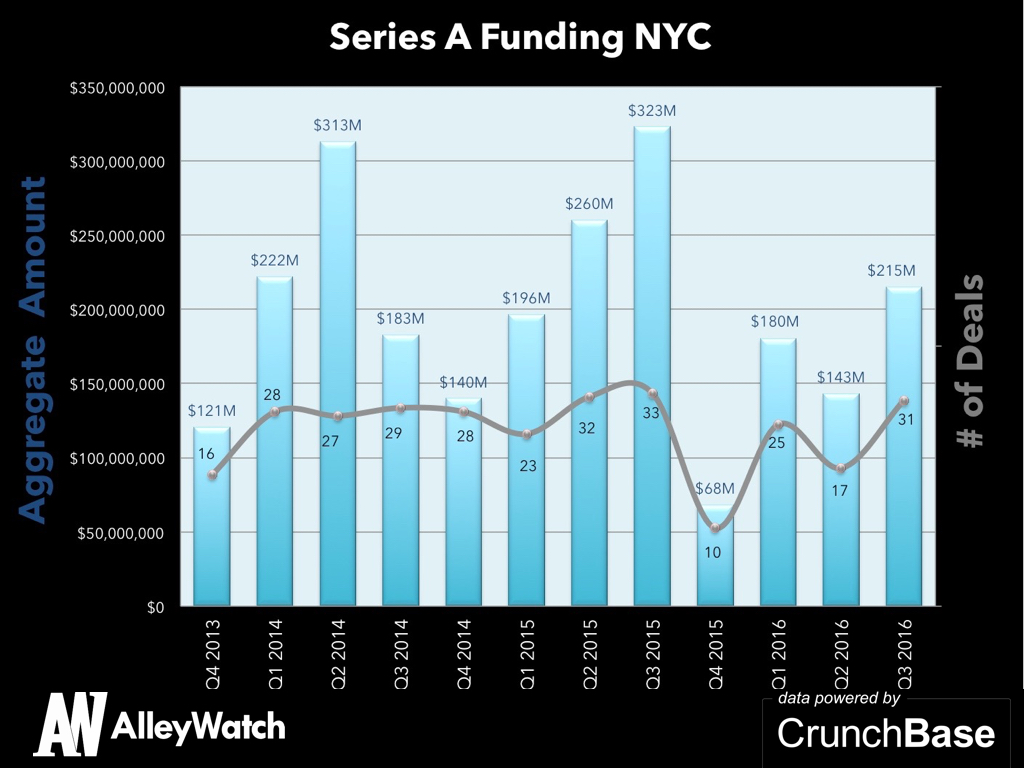 $215M was invested in 31 Series A rounds in Q3 of 2016 in NYC Tweet this