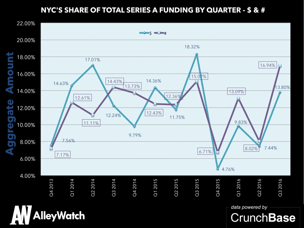 Q3 2016 NYC Series A rounds comprised 13.8% of total $ amount in the US with 16.94% of deals Tweet this