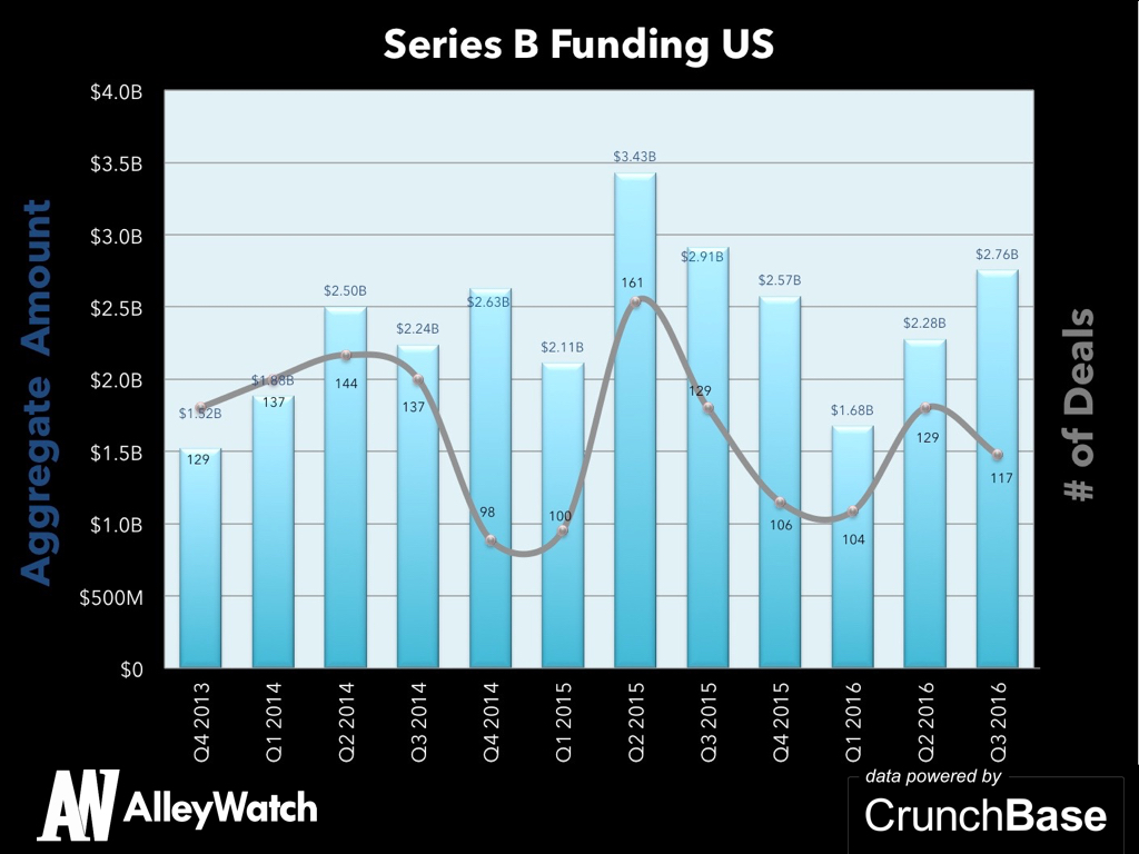 $2.8B was invested in 117 Series B rounds in Q3 of 2016 in the US Tweet this
