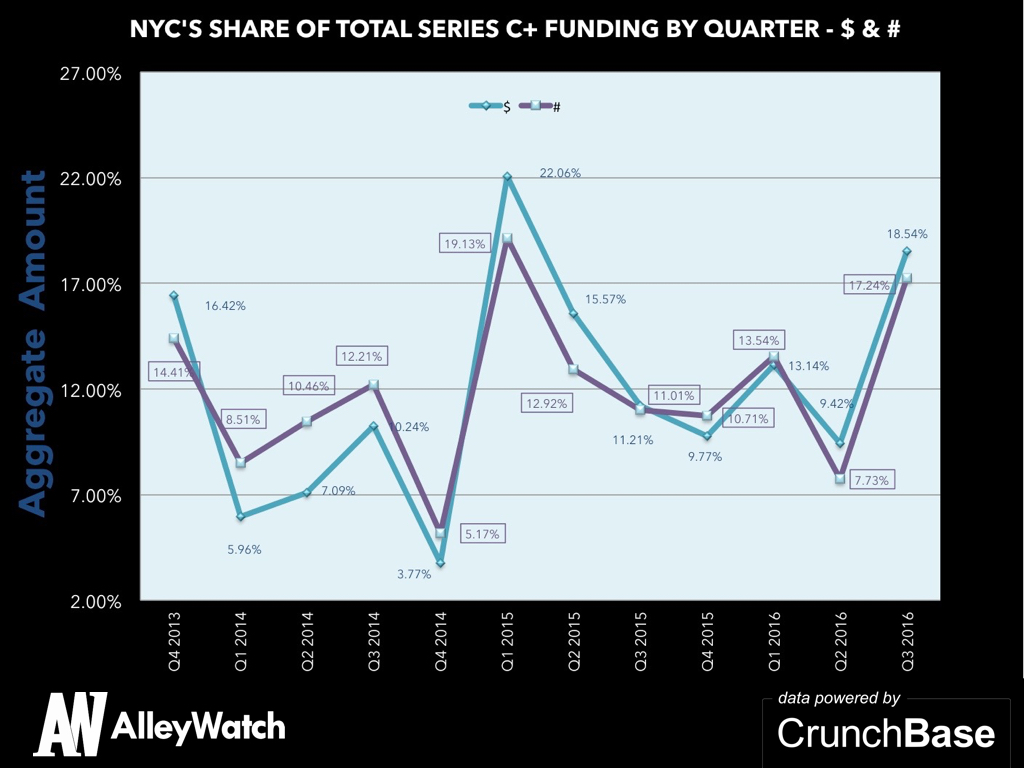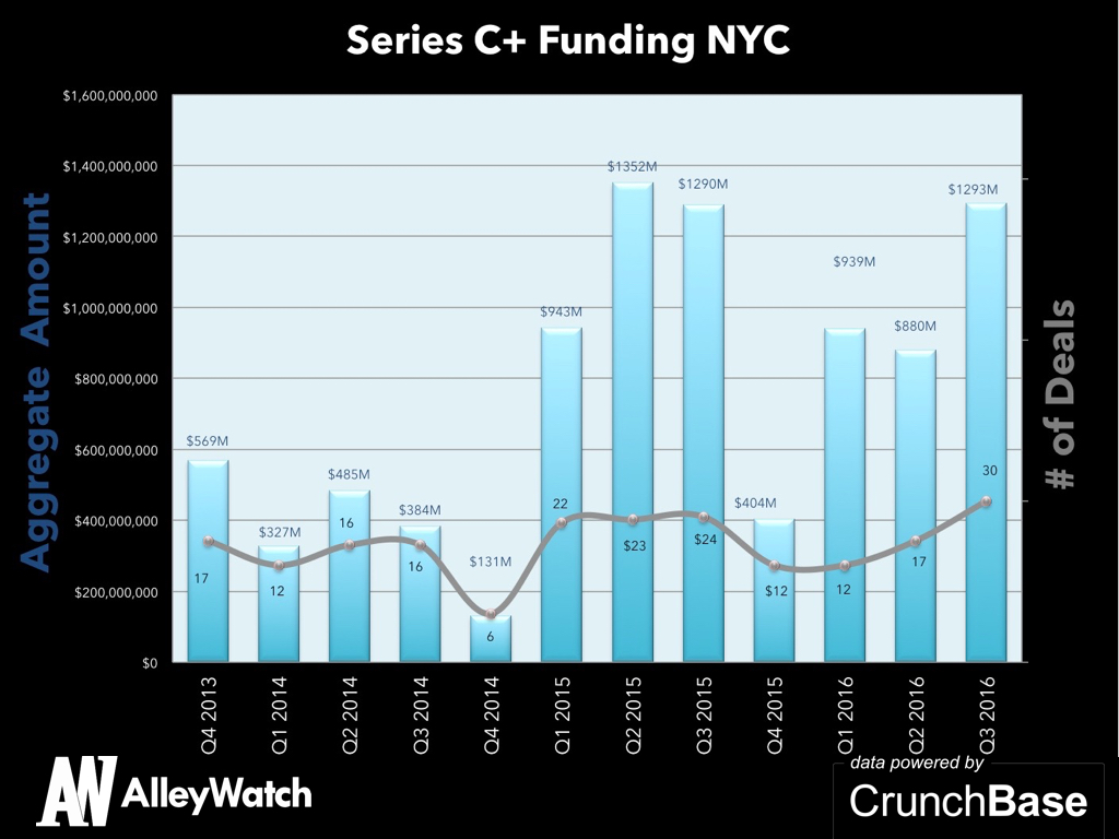 $1.3BM was invested in 30 Series C+ rounds in Q3 of 2016 in NYC Tweet this