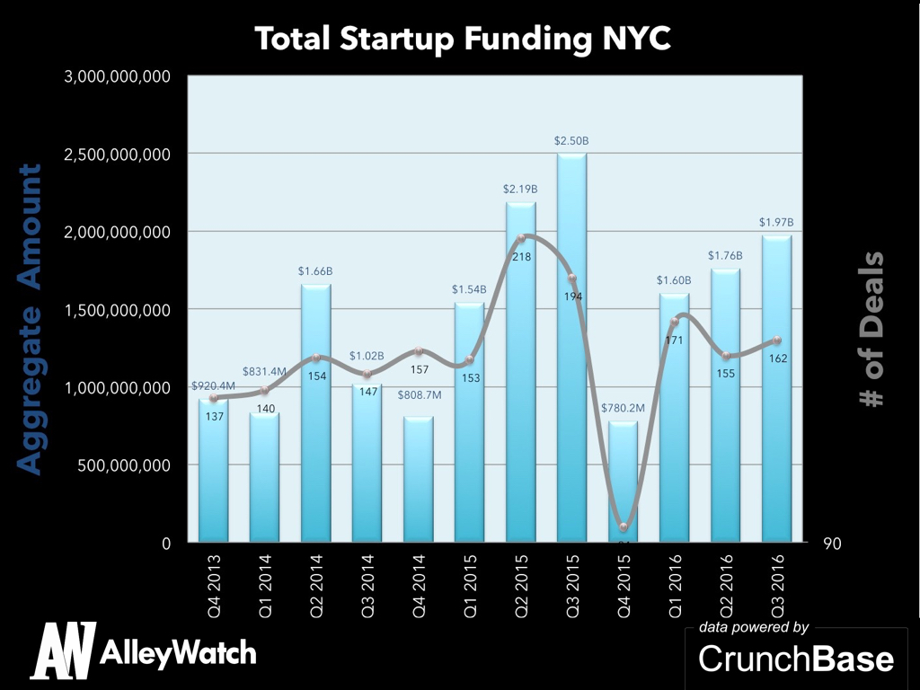 $2B was invested in 162 startup rounds in Q3 of 2016 in NYC Tweet this