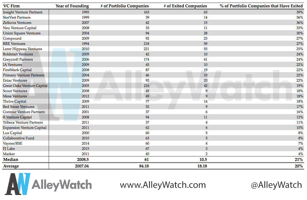 Liquidity tends to be of paramount importance when it comes to both entrepreneurs and venture capitalists making money. However, only a small subset of the startup universe will ever get to the acquisition or IPO stage. Today, I take a look at the exit rate of portfolio companies for a number of New York-based venture capital firms using some data from our friends at Crunchbase.