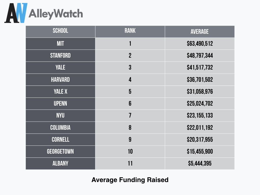 MIT jumps to the top with a clear lead in this section where average funding by graduates is examined. Notable companies founded by MIT grads include Oscar, BuzzFeed, letgo, Gilt Groupe, and ideeli.