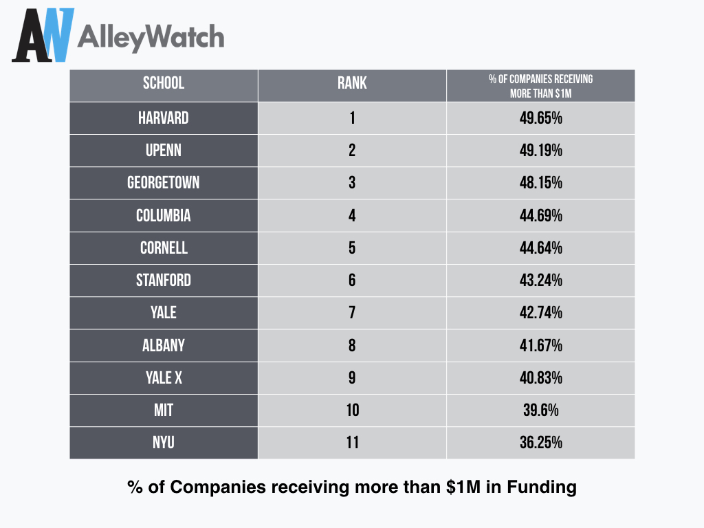 Harvard, UPenn, and Georgetown are at the top of the leaderboard in the % of companies founded that receive more than $1M in funding. Overall this is a tight space.