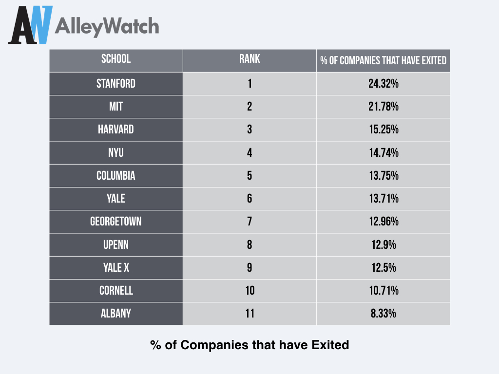 Our friends from the West Coast, Stanford takes the top spot along with MIT in percentage of companies founded that exit. There’s a clear lead for these two institutions. What are they teaching the students at these institutions? Perhaps it’s time to brush on one of Stanford’s entrepreneurial course offerings – Stanford in the Alley: An Overview of Technology Entrepreneurship.