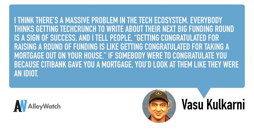 I think there’s a massive problem in the tech ecosystem. Everybody thinks getting TechCrunch to write about their next big funding round is a sign of success, and I tell people, “getting congratulated for raising a round of funding is like getting congratulated for taking a mortgage out on your house.” If somebody were to congratulate you because Citibank gave you a mortgage, you’d look at them like they were an idiot.