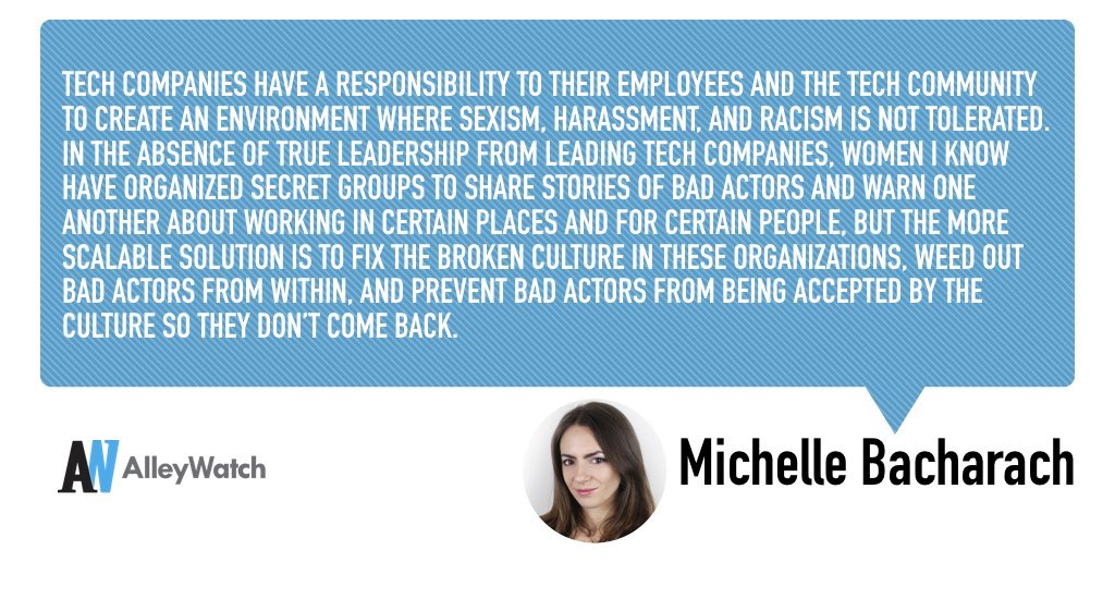 Tech companies have a responsibility to their employees and the tech community to create an environment where sexism, harassment, and racism is not tolerated. In the absence of true leadership from leading tech companies, women I know have organized secret groups to share stories of bad actors and warn one another about working in certain places and for certain people, but the more scalable solution is to fix the broken culture in these organizations, weed out bad actors from within, and prevent bad actors from being accepted by the culture so they don’t come back.