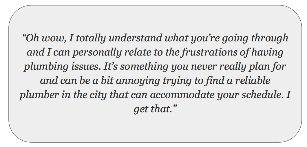 Right off the bat, our plumber made the mistake of not acknowledging the prospect’s emotions. You should always empathize and show the prospect that you understand what they’re going through, and that you’re going to help. Imagine how differently the conversation would’ve gone if the plumber said this: