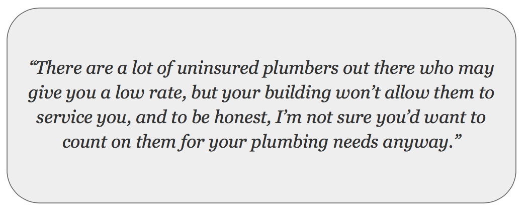After you show empathy with the prospect, the next step is to establish credibility. In this example, the plumber never gave the customer a reason to hire him. He didn’t establish any credibility for his company or the service he provides. Not surprisingly, the customer didn’t feel comfortable paying his rate because he didn’t build any value in his pricing. Here’s a script the plumber could have used to build value around his company and services: