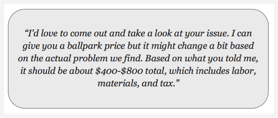 Usually, when someone objects to a price, you have failed to create enough value to justify it. In addition to not building enough value to justify the price, our plumber also failed to give the prospect a price quote that is easy to understand. He simply gave a price-per-hour quote, leaving the prospect with uncertainty around the total price. Here’s a script our plumber could have used to solve this problem: