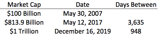 Not including the first 11,381 days it took Apple to go from $0 to $100 billion in value, Apple has added $100 billion in market cap, on average, every 519 days.