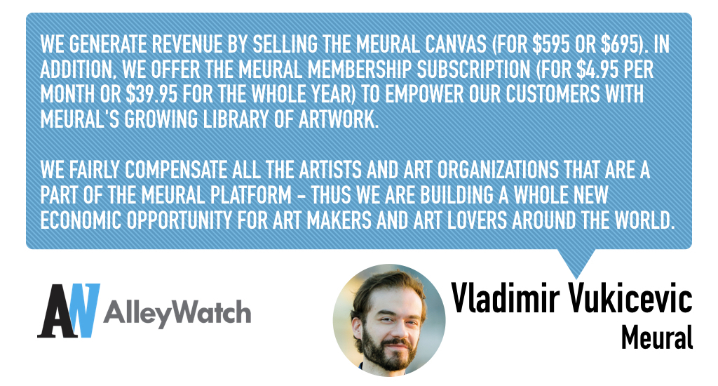 We generate revenue by selling the Meural Canvas (for $595 or $695). In addition, we offer the Meural Membership subscription (for $4.95 per month or $39.95 for the whole year) to empower our customers with Meural’s growing library of artwork.