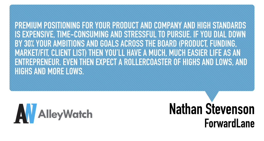 Premium positioning for your product and company and high standards is expensive, time-consuming and stressful to pursue. If you dial down by 30% your ambitions and goals across the board (product, funding, market/fit, client list) then you’ll have a much, much easier life as an entrepreneur. Even then expect a rollercoaster of highs and lows, and highs and more lows.