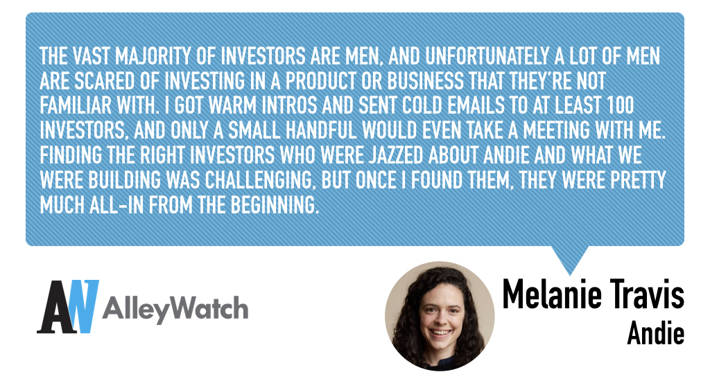 The vast majority of investors are men, and unfortunately a lot of men are scared of investing in a product or business that they’re not familiar with. I got warm intros and sent cold emails to at least 100 investors, and only a small handful would even take a meeting with me. Finding the right investors who were jazzed about Andie and what we were building was challenging, but once I found them, they were pretty much all-in from the beginning.