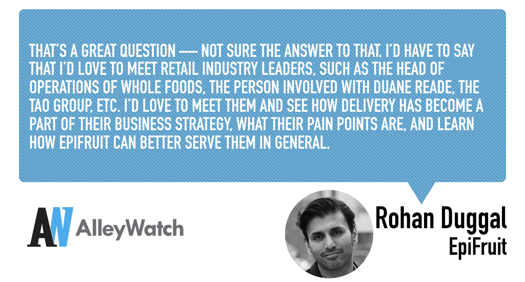 That’s a great question — not sure the answer to that. I’d have to say that I’d love to meet retail industry leaders, such as the head of operations of Whole Foods, the person involved with Duane Reade, the Tao Group, etc. I’d love to meet them and see how delivery has become a part of their business strategy, what their pain points are, and learn how EpiFruit can better serve them in general.