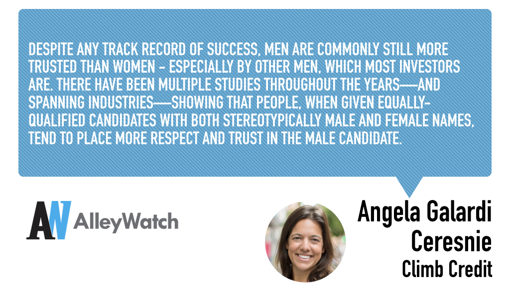Despite any track record of success, men are commonly still more trusted than women – especially by other men, which most investors are. There have been multiple studies throughout the years—and spanning industries—showing that people, when given equally-qualified candidates with both stereotypically male and female names, tend to place more respect and trust in the male candidate.