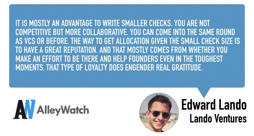 It is mostly an advantage to write smaller checks. You are not competitive but more collaborative. You can come into the same round as VCs or before. The way to get allocation given the small check size is to have a great reputation. And that mostly comes from whether you make an effort to be there and help founders even in the toughest moments. That type of loyalty does engender real gratitude.