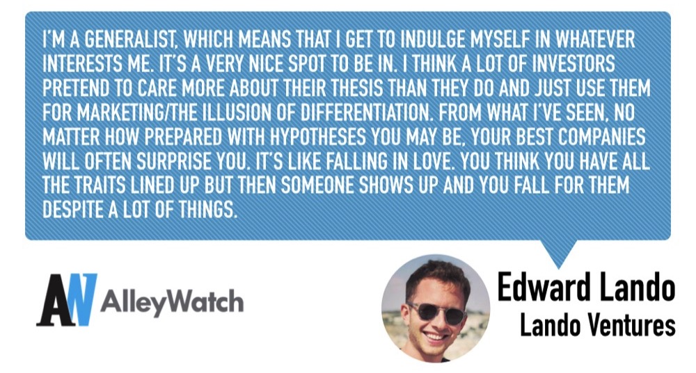 Welcome back to Inside the Mind of a NYC Angel Investor, a popular series at AlleyWatch in which we speak with New York City-based Angel Investors. In the hot seat this time is Edward Lando of Lando Ventures. He has made investments in over 120 startups in a very short period of time and names in the portfolio include The Infatuation, Reddit, Built Robotics, Parsely Health, Current, and Simple Contacts.