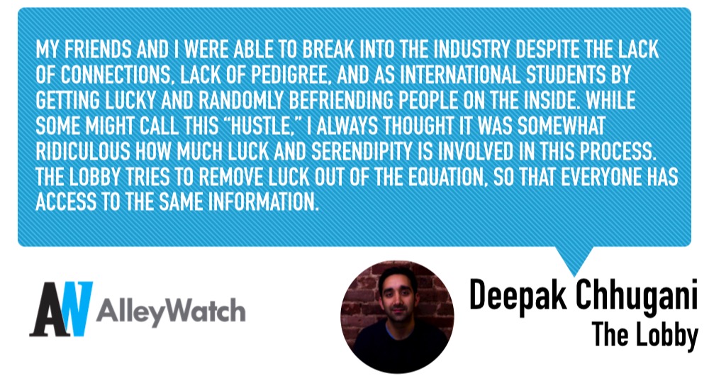 My friends and I were able to break into the industry despite the lack of connections, lack of pedigree, and as international students by getting lucky and randomly befriending people on the inside. While some might call this “hustle,” I always thought it was somewhat ridiculous how much luck and serendipity is involved in this process. The Lobby tries to remove luck out of the equation so that everyone has access to the same information.