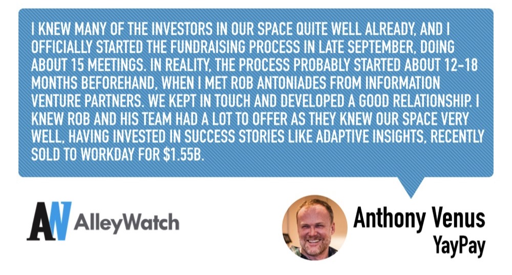I knew many of the investors in our space quite well already, and I officially started the fundraising process in late September, doing about 15 meetings. In reality, the process probably started about 12-18 months beforehand, when I met Rob Antoniades from Information Venture Partners. We kept in touch and developed a good relationship. I knew Rob and his team had a lot to offer as they knew our space very well, having invested in success stories like Adaptive Insights, recently sold to Workday for $1.55B.