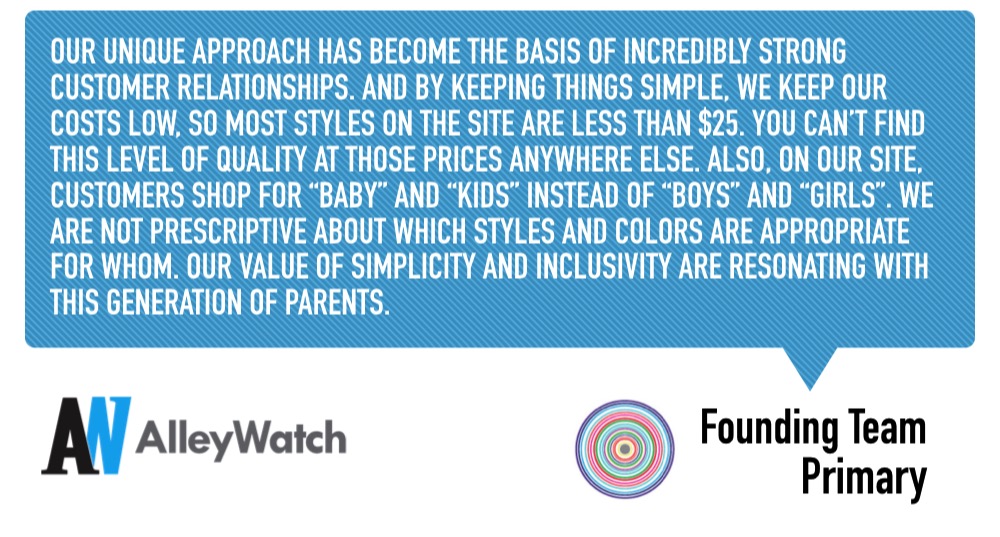 Primary is taking a different approach by focusing on timeless essentials in a rainbow of colors, rather than chasing trends. Our assortment is curated around the styles that babies and kids live in, and that parents can re-buy as their kids grow. Our unique approach has become the basis of incredibly strong customer relationships. And by keeping things simple, we keep our costs low, so most styles on the site are less than $25. You can’t find this level of quality at those prices anywhere else. Also, on our site, customers shop for “baby” and “kids” instead of “boys” and “girls”. We are not prescriptive about which styles and colors are appropriate for whom. Our value of simplicity and inclusivity are resonating with this generation of parents.