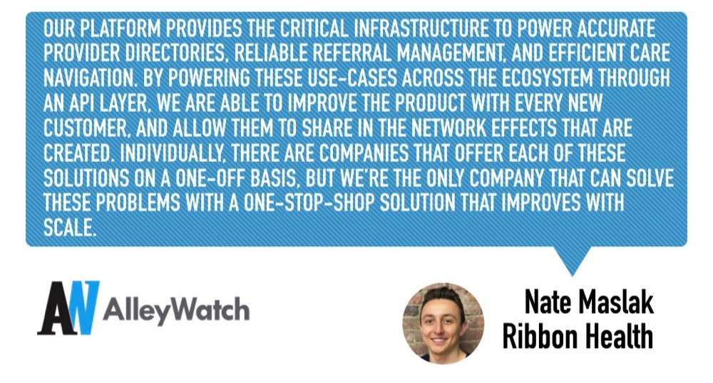 When navigating your choices for choosing healthcare providers, insurance companies have traditionally sent you a directory that’s as thick as a phone book.  Not only is the physical directory challenging to use, but it’s also static and often contains outdated information.  Enter Ribbon Health, a health data platform that powers payers, providers, and digital health companies with accurate data through an API layer that integrates into existing workflows.  The various participants in the healthcare system are able to seamlessly integrate comprehensive information on doctors, insurance plans, cost and quality of care data from thousands of sources, resulting in a continuously updating and accurate repository.  All this leads to a better experience for patients navigating the healthcare system while introducing efficiencies for providers, insurance companies, and healthcare institutions.