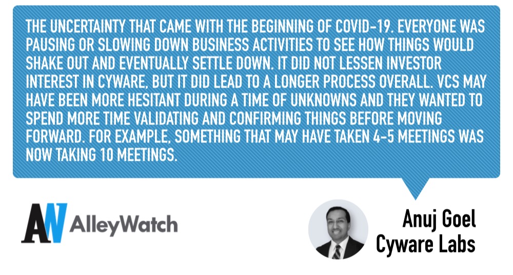 The uncertainty that came with the beginning of COVID-19. Everyone was pausing or slowing down business activities to see how things would shake out and eventually settle down. It did not lessen investor interest in Cyware, but it did lead to a longer process overall. VCs may have been more hesitant during a time of unknowns and they wanted to spend more time validating and confirming things before moving forward. For example, something that may have taken 4-5 meetings was now taking 10 meetings.