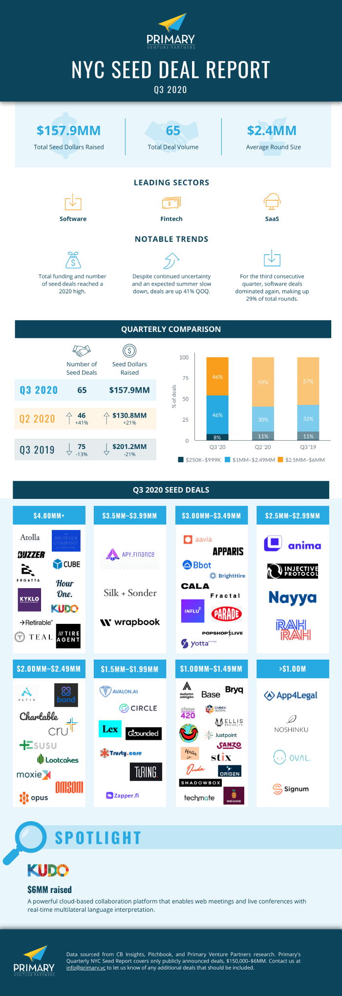 Last year in Q3 we reached an all-time seed activity high in NYC. This year, while deals are down 13% and total funding is down 21% YoY, the numbers are still at the highest they’ve been since that record-breaking Q3 2019 quarter.
