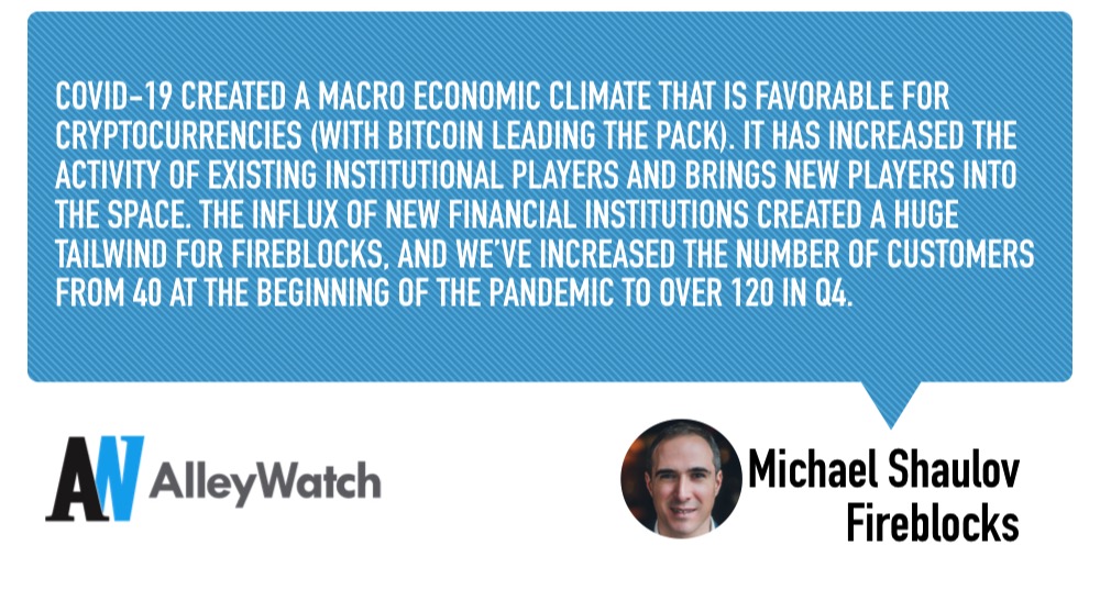 COVID-19 created a macroeconomic climate that is favorable for cryptocurrencies (with bitcoin leading the pack). It has increased the activity of existing institutional players and brings new players into the space. The influx of new financial institutions created a huge tailwind for Fireblocks, and we’ve increased the number of customers from 40 at the beginning of the pandemic to over 120 in Q4.